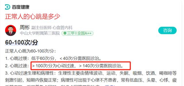 从百度百科的数据来看,正常人心跳是60—100,超过140就要去医院了。